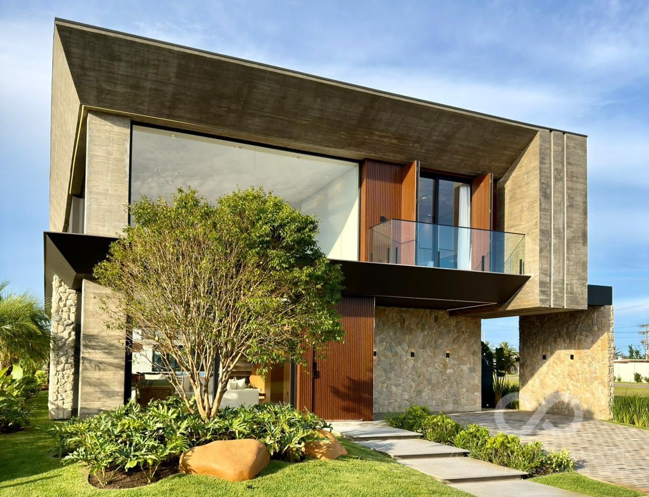 - Escada totalmente revestida em madeira natural e guarda corpo com vidro laminado 5+5