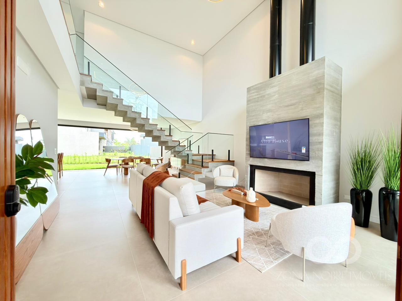 - Sala de Estar com pé direito duplo e com Lareira em concreto aparente